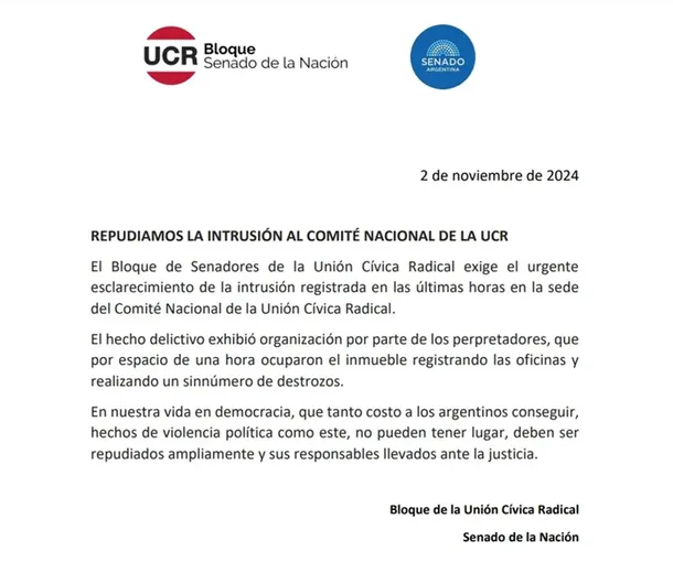 ‘El Bloque de Senadores de la Unión Cívica Radical exige el urgente esclarecimiento de la intrusión registrada en las últimas horas en la sede del Comité Nacional de la Unión Cívica Radical’, comienza el comunicado difundido este sábado.