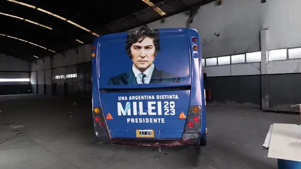 El vehículo ploteado con la cara del dirigente de ultraderecha y la frase «Una Argentina distinta» fue presentado, a través de tuit, por el director de cine Santiago Oría, uno de los publicistas de campaña y director de la película «La revolución liberal».