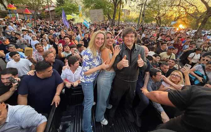 El mandatario estuvo acompañado por su hermana y secretaria general de la Presidencia, Karina Milei, y por la candidata a diputada nacional, la exvedette Virginia Gallardo.
