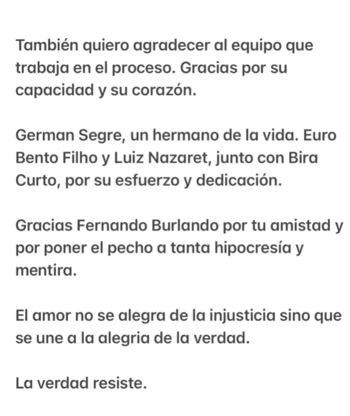 “Gracias Fernando Burlando por tu amistad y por poner el pecho a tanta hipocresía y mentira”, añadió y concluyó: “El amor no se alegra de la injusticia, sino que une a la alegría de verdad. La verdad resiste”.