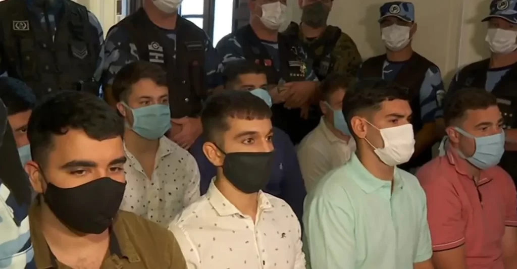 Con barbijos cubriéndoles las caras y en medio de un fuerte operativo de seguridad, Máximo Thomsen (23), Enzo Comelli (22), Matías Benicelli (23), Blas Cinalli (21), Ayrton Viollaz (23), y Luciano (21), Ciro (22) y Lucas Pertossi (23) llegaron cerca de las 9 esta mañana a los Tribunales de Dolores para ocupar, por primera vez, el banquillo de los acusados.