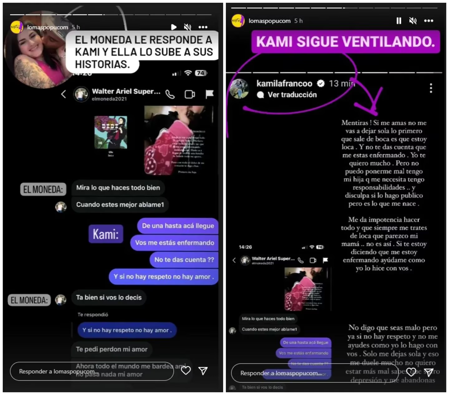 En otras de las capturas que compartieron en la misma página, Kami expresó: “Mentiras. Si me amás no me vas a dejar sola. Lo primero que sale de tu boca es que estoy loca. Y no te das cuenta de que me estás enfermando. Yo te quiero mucho. Pero no puedo ponerme mal porque tengo una hija que me necesita, tengo responsabilidades”.