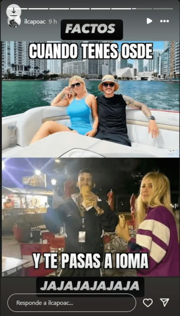 En la primera foto, la conductora está junto al futbolista en un yate con la leyenda “cuando tenés Osde”, en referencia a la prepaga; mientras que en la segunda la mediática aparece comiendo un choripán junto al músico con el texto “y te pasas a Ioma”. Además, sobre el meme, el mediático escribió “Factos” y compartió una risa burlona.
