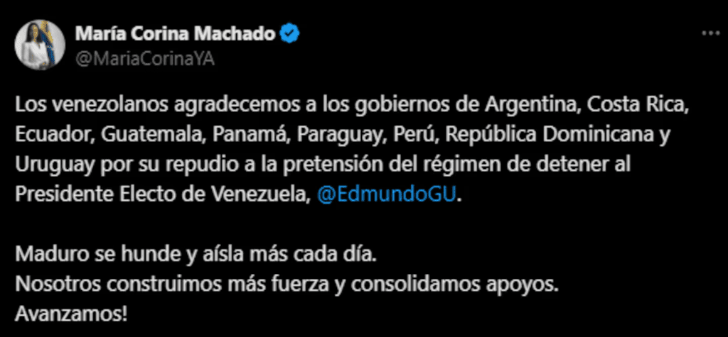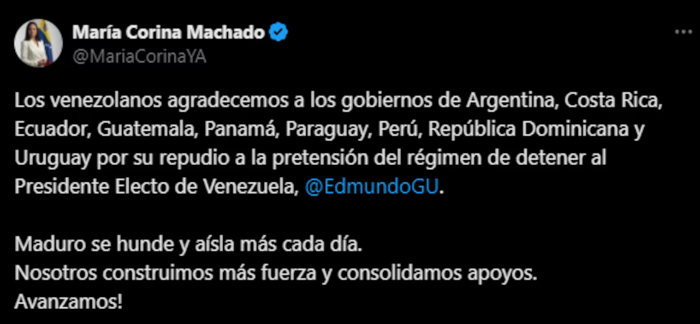 La líder de la oposición venezolana, María Corina Machado, agradeció en X la condena regional. “Los venezolanos agradecemos a los gobiernos de Argentina, Costa Rica, Ecuador, Guatemala, Panamá, Paraguay, Perú, República Dominicana y Uruguay por su repudio a la pretensión del régimen de detener al Presidente Electo de Venezuela, @EdmundoGU. Maduro se hunde y aísla más cada día. Nosotros construimos más fuerza y consolidamos apoyos. Avanzamos!”, escribió.