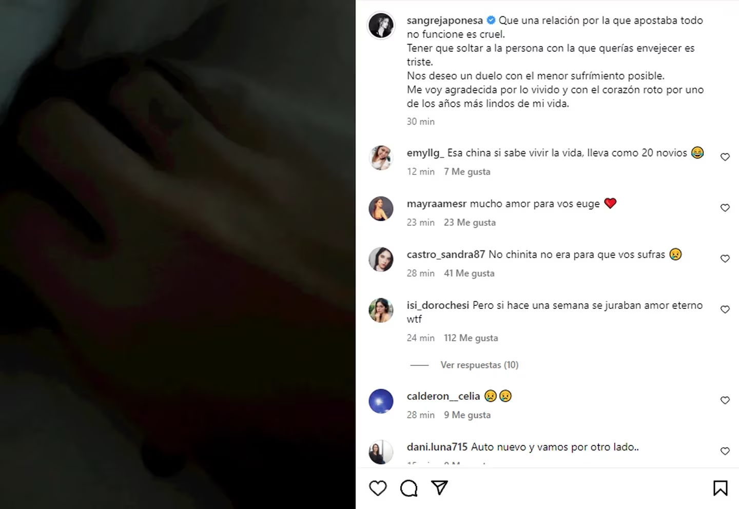 El posteo tuvo una gran repercusión y los seguidores de la ex Casi Ángeles se mostraron muy tristes por la noticia. “Es la primera vez que pone algo así después de una ruptura, ¿qué habrá pasado?”, “Chinita, no queremos que sufras”, “no quería creerlo, espero que lo transiten de la mejor manera posible”, y “qué pena que no haya funcionado una pareja tan bonita”, fueron algunos de los mensajes.