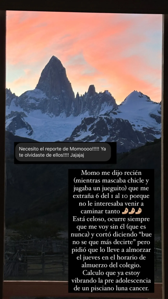 Jimena Barón se tomó unos días de vacaciones con su novio Matías Palleiro en El Chaltén, y parece que su hijo Momo -fruto de su relación con Daniel Osvaldo– no lo tomó muy bien.