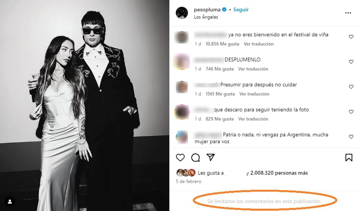En tanto, al ver que los hostiles comentarios no cesaban, tras ver otros tantos como «Canceladísimo», «Megan Fox de Argentina no se toca», «Por eso no lo queremos en Viña, ni Chile» o «Infiel», Peso Pluma optó cerrar los comentarios a sus seguidores.