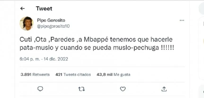 «¡Y, cuando se pueda, muslo-pechuga!», sentenció Pipo Gorosito en sus redes sociales, en una publicación que llamó la atención de todos sus seguidores, en medio de la expectativa por la gran final del Mundial de Qatar 2022 entre la Selección Argentina y Francia.