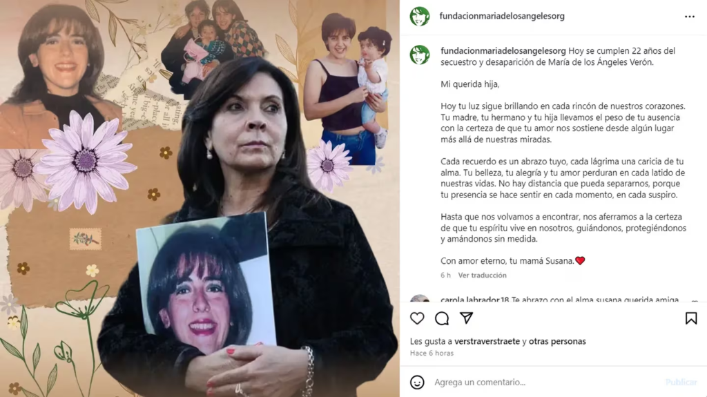 Este miércoles se cumplen 22 años del secuestro y desaparición de María de los Ángeles Verón, más conocida como Marita Verón, la joven tucumana víctima de trata de personas, cuyo caso es un emblema nacional. En un nuevo aniversario del horror, su mamá, Susana Trimarco, la recordó con una emotiva carta.