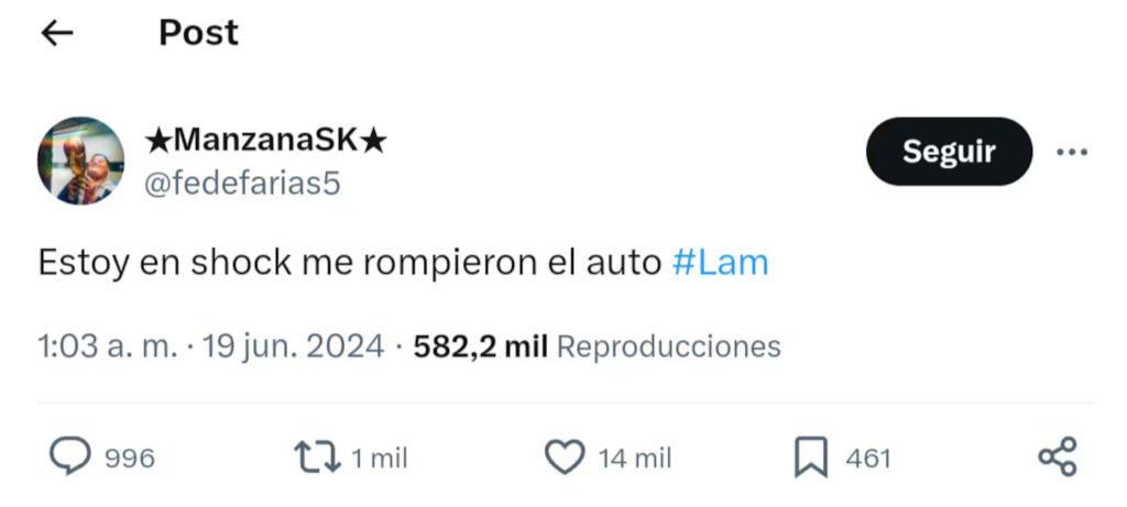 “Estoy en shock, me rompieron el auto”, escribió Federico “Manzana” Farías en su perfil de Twitter, este miércoles por la madrugada. Además, en sus redes sociales recibió todo tipo de mensajes de odio.