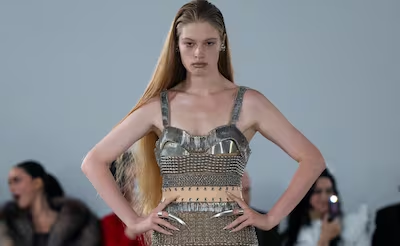 Ayer lunes fue el día más intenso para la nueva modelo, pues se anotó dos desfiles más en su haber: primero, para la marca Chris Habana, con un vestido transgresor hecho de cadenas metálicas, y luego para Dauphinette, con un vestido abullonado blanco y adornos de escarabajos por todo el cuerpo.
