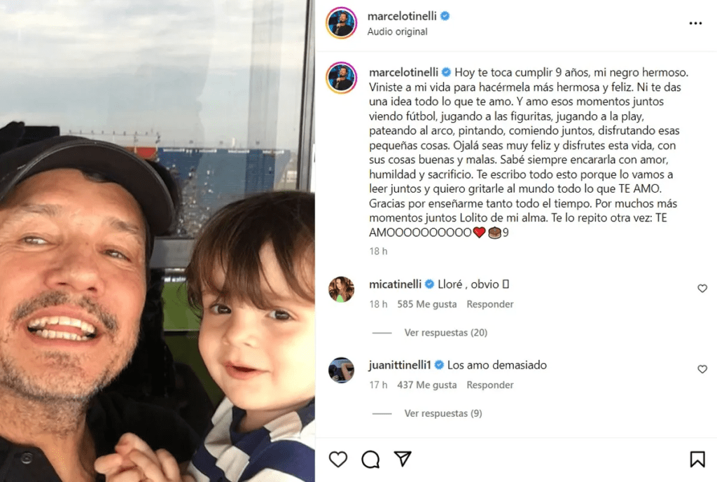 «Hoy te toca cumplir 9 años, mi negro hermoso. Viniste a mi vida para hacérmela más hermosa y feliz. Ni te das una idea todo lo que te amo. Y amo esos momentos juntos viendo fútbol, jugando a las figuritas, jugando a la Play, pateando al arco, pintando, comiendo juntos, disfrutando esas pequeñas cosas», indicó Marcelo Tinelli en un movilizante posteo dedicado a su hijo.