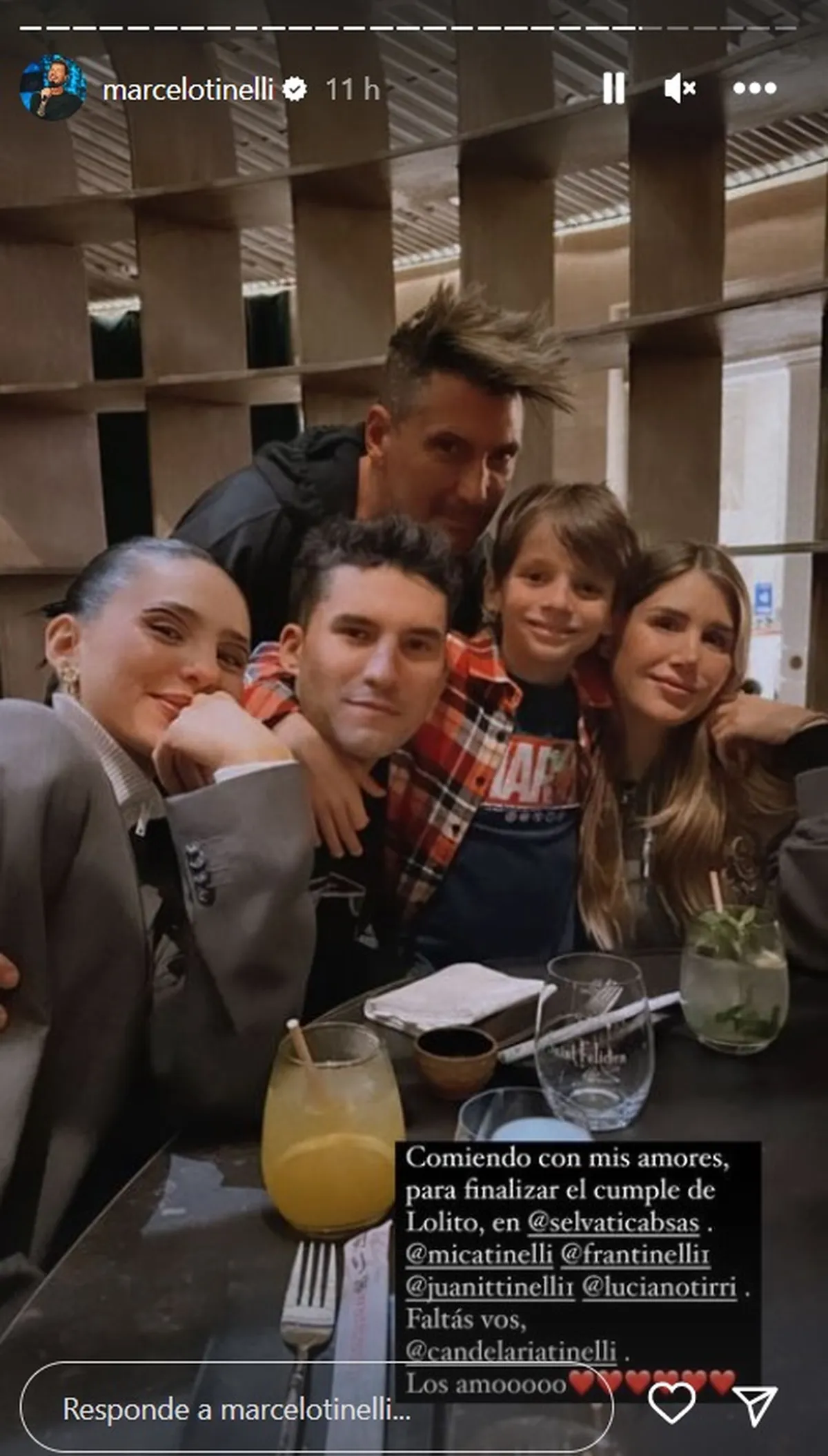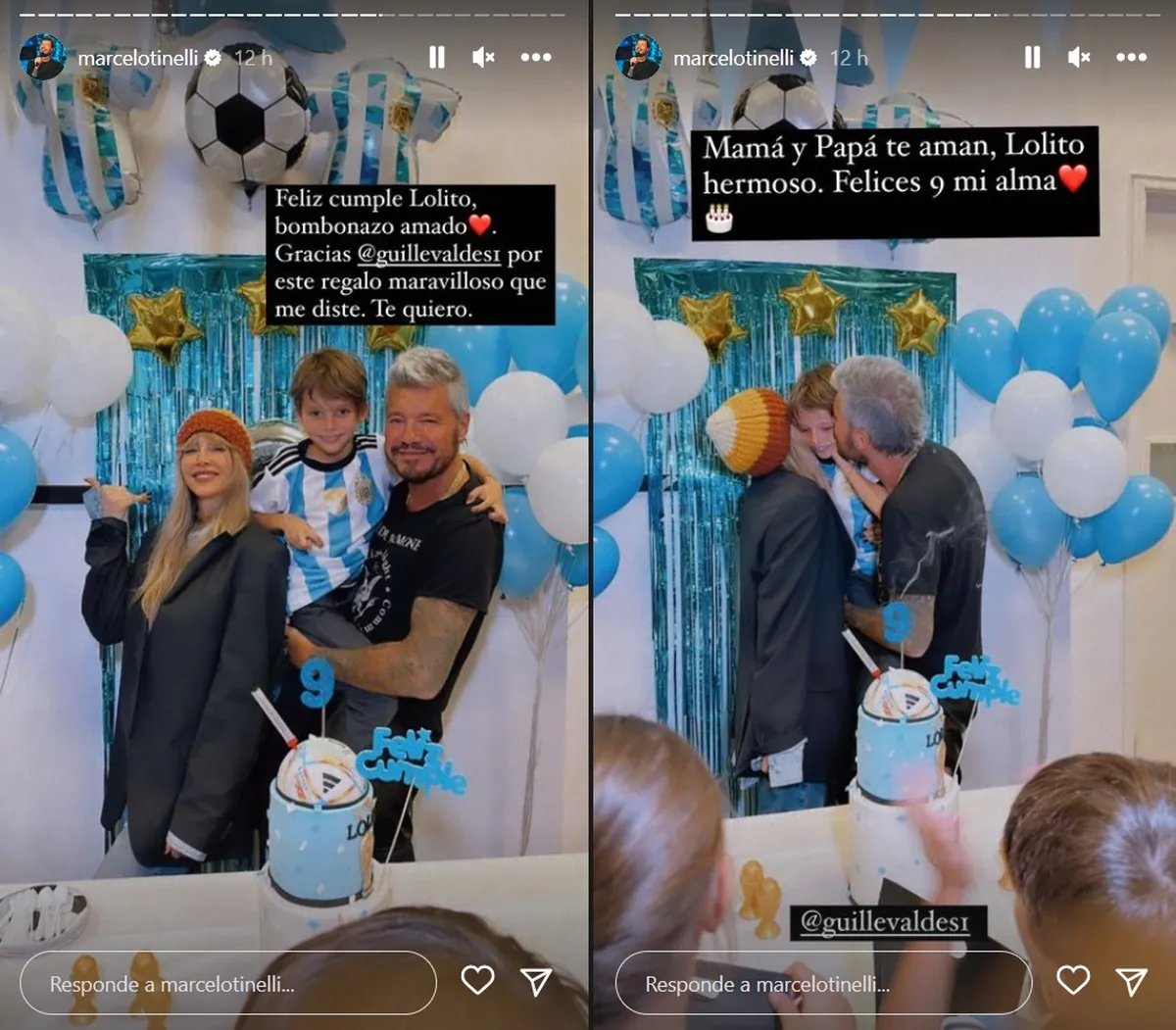 “Feliz cumple, Lolito, bombonazo amado. Gracias Guille por este regalo maravilloso que me diste. Te quiero. Mamá y papá te aman, Lolito hermoso. Felices 9, mi alma”, expresó emocionado Marcelo en sus historias de Instagram con fotos con su hijo y su ex pareja.
