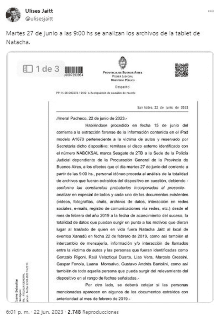 En el documento judicial que el propio Jaitt difundió en su momento, se establece que los investigadores intentan clarificar si hay elementos que aporten a lo que ocurrió la madrugada del 23 de febrero de 2019, en el salón Xanadú, el lugar en el que apareció muerta Natacha.