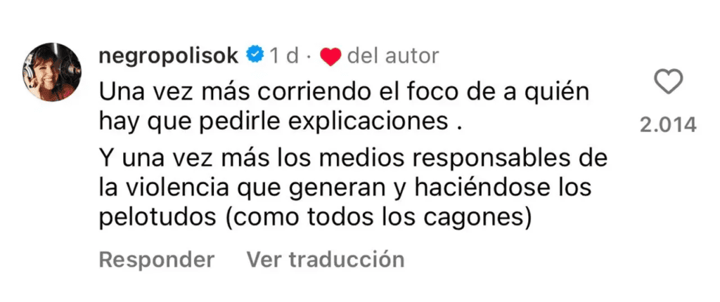 “Una vez más corriendo el foco de a quién hay que pedirle explicaciones. Y una vez más los medios responsables de la violencia que generan y haciéndose los pelotu… (como todos los cagones)”, escribió la Negra en el posteo de la hija de Pettinato que ya tiene 42 mil likes.