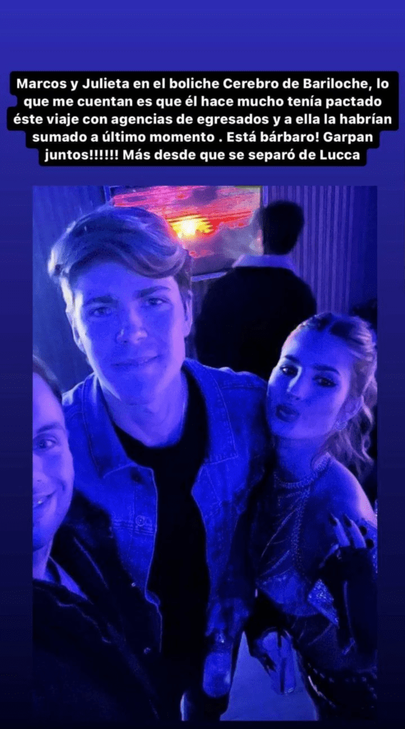 Marcos Ginocchio y Julieta Poggio viajaron a Bariloche, donde ya compartieron varios momentos juntos. Si bien ella aterrizó con su hermana Camila y él en compañía de un amigo tocayo, la empresa que los contrató organizó presencias para que se cruzaran todo el tiempo, y anoche se los vio muy pegados en el boliche Cerebro.