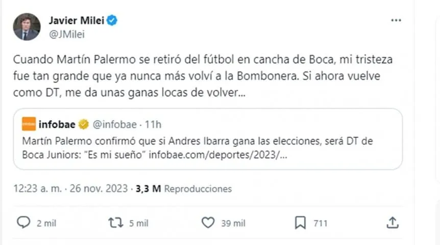 «Cuando Martín Palermo se retiró del fútbol en cancha de Boca, mi tristeza fue tan grande que ya nunca más volví a la Bombonera. Si ahora vuelve como DT, me da unas ganas locas de volver…», escribió en la red social X el futuro primer mandatario, que asumirá el mando el 10 de diciembre.