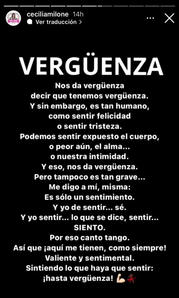 El texto fue escrito por ella y lo tituló vergüenza al compartirlo tanto en sus historias como en su perfil. «¡Siento! Por eso, canto tango. Así que… ¡aquí me tienen, como siempre! Valiente y sentimental. Sintiendo lo que haya que sentir: ¡hasta vergüenza!», concluyó.