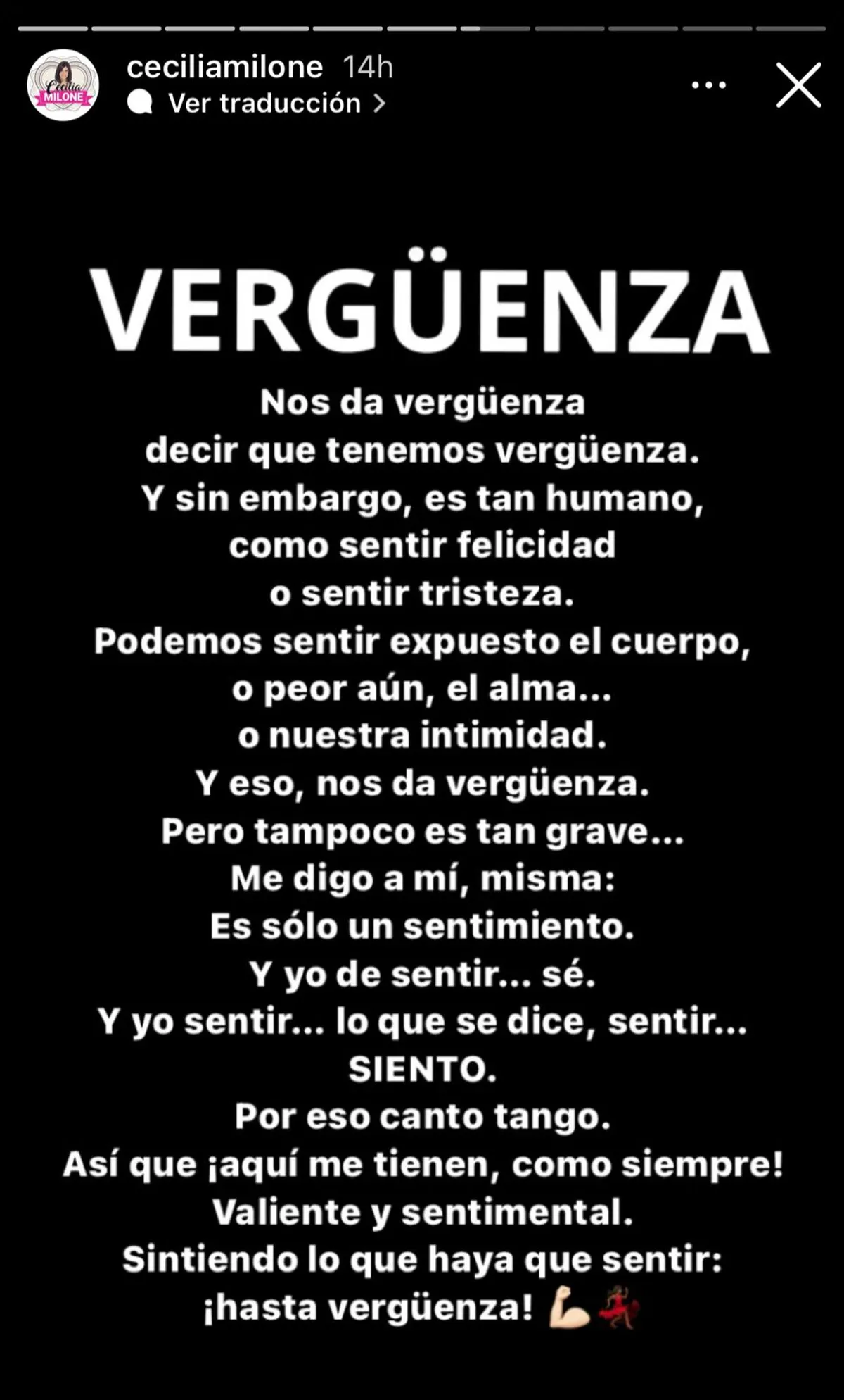 El texto fue escrito por ella y lo tituló vergüenza al compartirlo tanto en sus historias como en su perfil. «¡Siento! Por eso, canto tango. Así que… ¡aquí me tienen, como siempre! Valiente y sentimental. Sintiendo lo que haya que sentir: ¡hasta vergüenza!», concluyó.