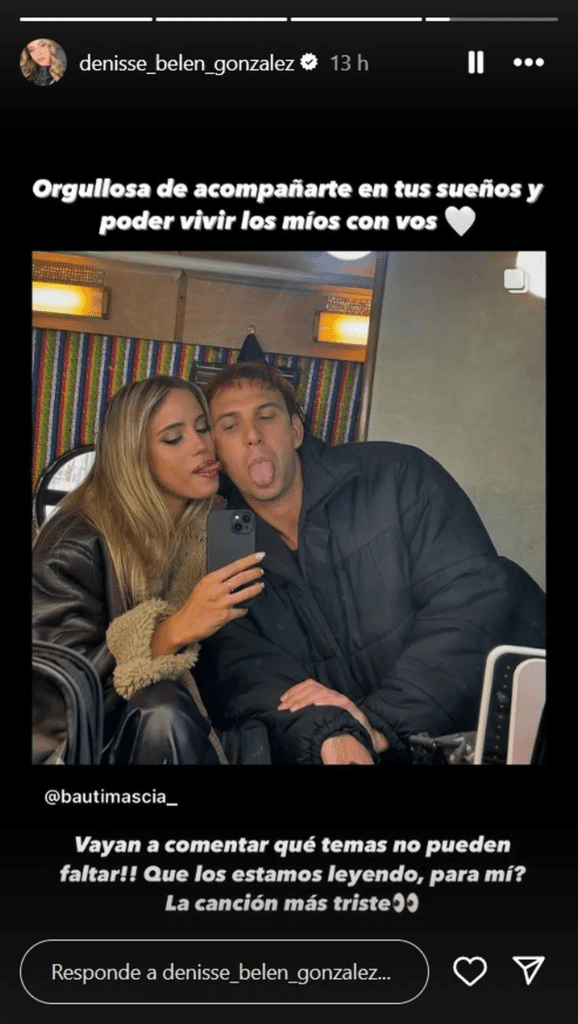 «Orgullosa de acompañarte en tus sueños y poder vivir los míos con vos», escribió emocionada la ex GH con el emoji de un corazón.