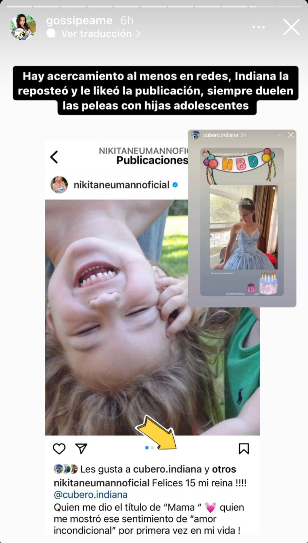Inmediatamente, las miradas se corrieron a la reacción de Indiana frente al gesto de su mamá y finalmente la respuesta llegó. “Hay acercamiento al menos en redes”, comunicó la cuenta @gossipeame.