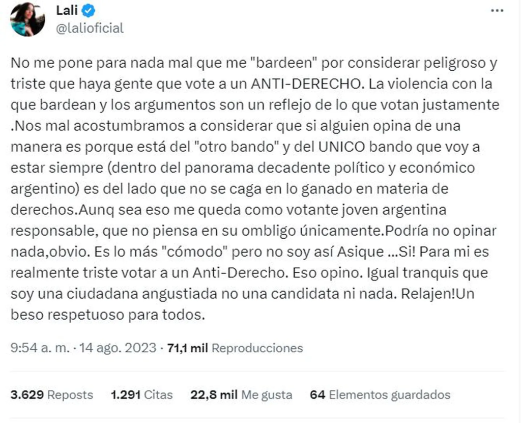 En su nuevo posteo, Lali fue más extensa en sus impresiones. “No me pone para nada mal que me ‘bardeen’ por considerar peligroso y triste que haya gente que vote a un ANTI-DERECHO”, sostuvo.