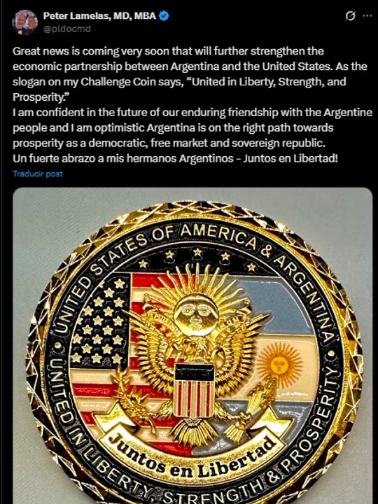 «Pronto tendremos grandes noticias que fortalecerán aún más la alianza económica entre Argentina y Estados Unidos. Como dice el lema de mi Moneda de Desafío: ‘Unidos en Libertad, Fuerza y Prosperidad'», indicó a través de un mensaje que difundió por su cuenta de la red social X.