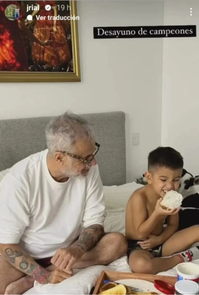 En la primera imagen se puede ver a Jorge comenzando el día junto a su nieto los dos en la cama mientras el niño comía una rodaja de pan con queso crema. «Desayuno de campeones», reflejó el conductor.