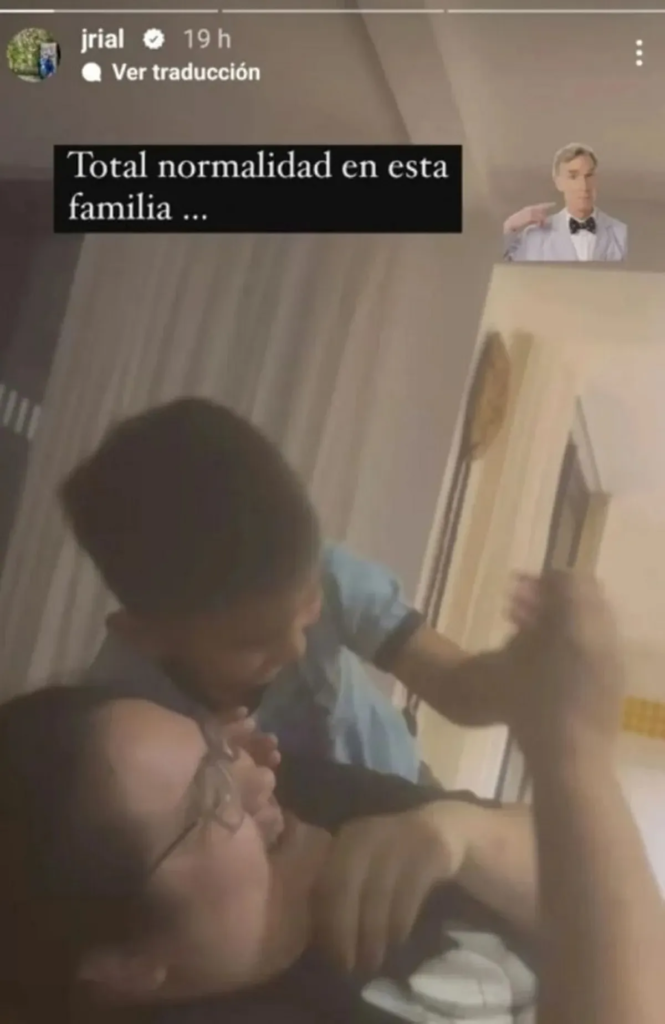 Luego, en la otra postal, Rial mostró a su otra hija Rocío Rial, jugando con su sobrino a pura risa. «Total normalidad en esta familia…», indicó Jorge en la historia.