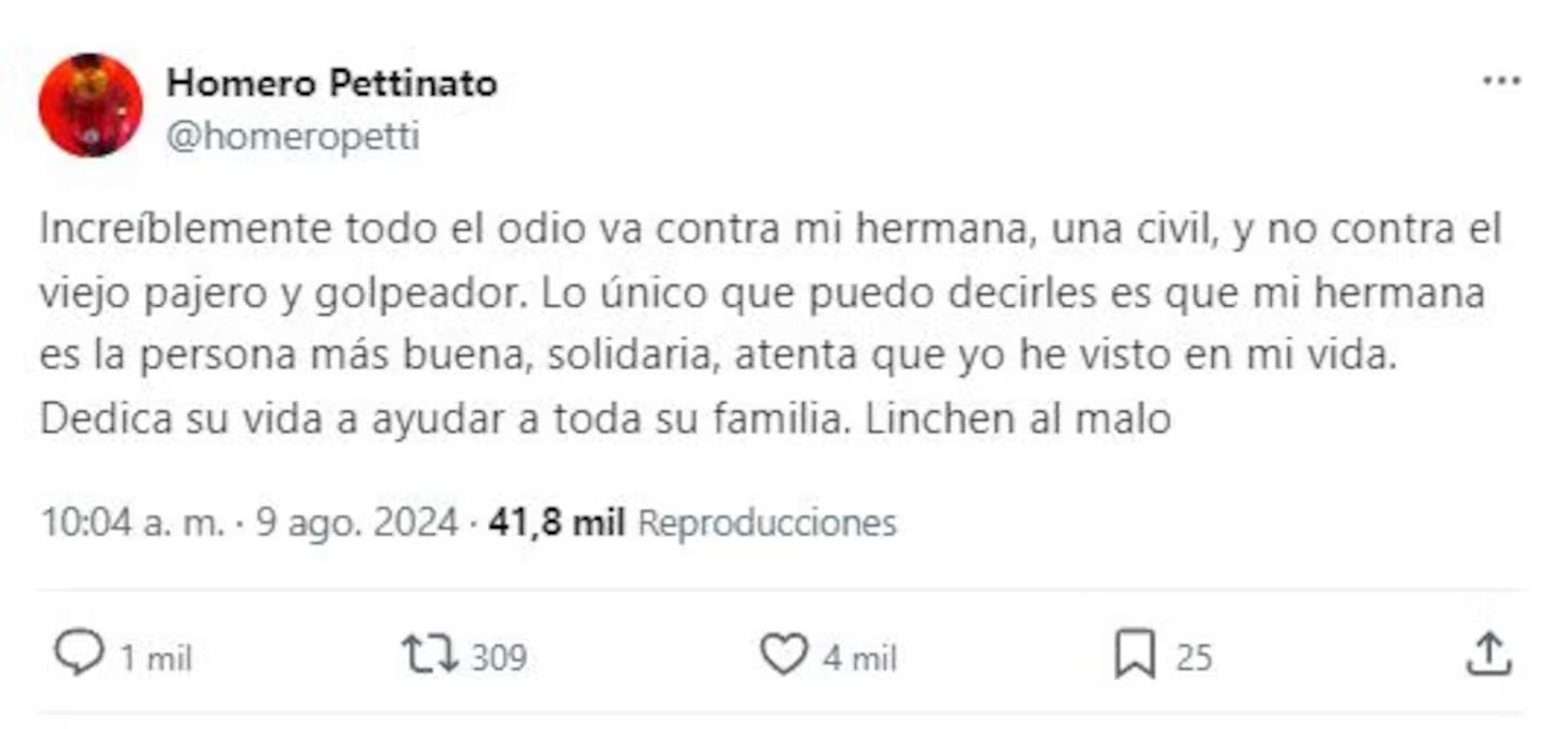 A través de X, Pettinato habló sobre Tamara. “Increíblemente todo el odio va contra mi hermana, una civil, y no contra el viejo paj… y golpeador”, sostuvo, en una feroz crítica al expresidente.