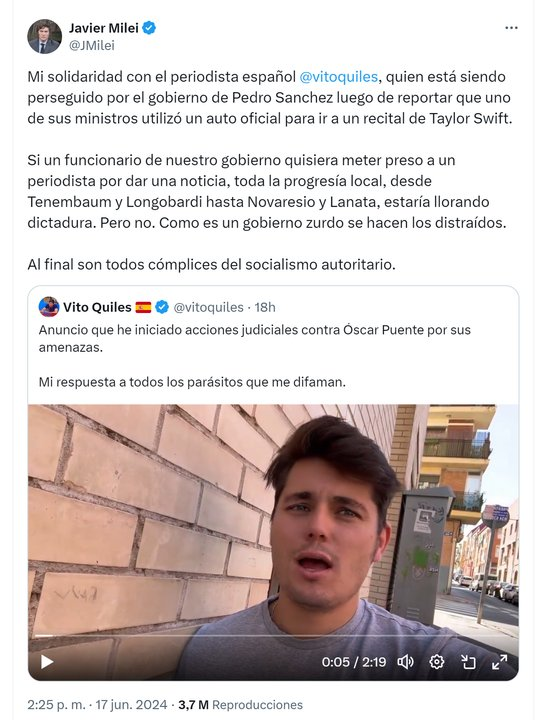 Javier Milei volvió a criticar a la prensa nacional a través de su cuenta de X (ex Twitter) con un ejemplo de un periodista español. Se trata de Vito Quiles, quien denunció una supuesta persecución por el Gobierno español, tras haber publicado que uno de los ministros de Sánchez habría utilizado un auto oficial para ir al recital de la cantante pop Taylor Swift.