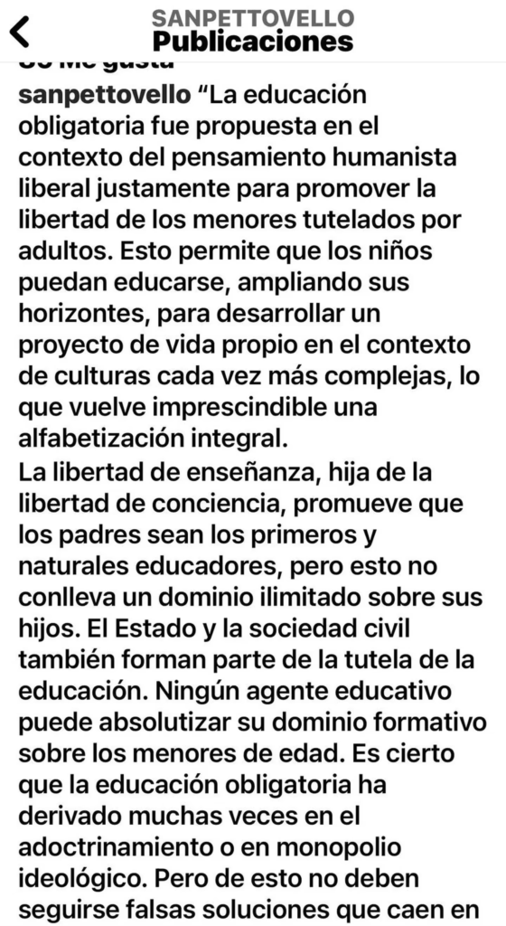 En la publicación que la ministra difundió en sus redes sociales personales, posteó un extenso texto que dejó en claro que la posición del ministerio de Capital Humano -que tiene bajo su órbita a la secretaría de Educación- está en las antípodas de los dichos de Benegas Lynch.