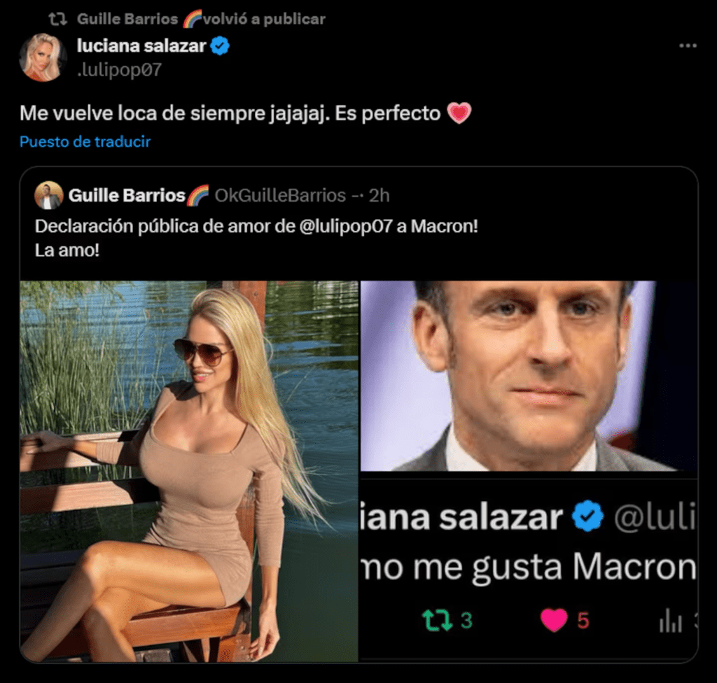 El inesperado posteo no pasó desapercibido para el periodista Guillermo Barrios, quien reposteó el mensaje de la blonda y escribió: “¡Declaración pública de amor de @lulipop07 a Macron! ¡La amo!”. Ella inmediatamente replicó: “Me vuelve loca desde siempre jajajaja. Es perfecto”.