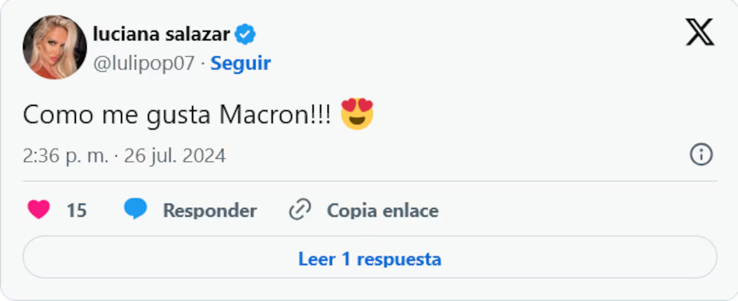 En medio de la esperada celebración de apertura de los Juegos Olímpicos de París 2024, Luciana Salazar le dedicó un sensual piropo a Emmanuel Macron. La modelo, quien estuvo muy atenta a esta inauguración deportiva de escala mundial, escribió en su usuario de su cuenta en X (ex Twitter): “¡Cómo me gusta Macron!”. Acompañó el mensaje con un emoji de carita enamorada.