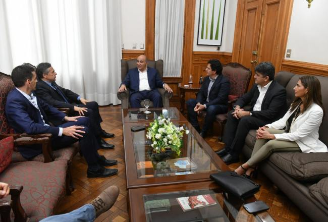 El gobernador, Juan Manzur, recibió este martes por la mañana, en su despacho de Casa de Gobierno, al ministro de Transporte de la Nación, Diego Giuliano; al presidente de Trenes Argentinos, Martín Marinucci; y al gerente general de Operaciones de esa compañía, Marcelo Sánchez, quienes visitan la provincia para inaugurar el puente ferroviario sobre el río Salí, que une la capital tucumana con Alderetes, permitiendo que el tren Mitre llegue a la estación ubicada frente a la plaza Alberdi. Además, las autoridades dejarán inauguradas mejoras en dicha terminal.