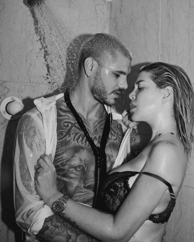 En sus redes sociales, Mauro Icardi compartió un par de postales muy subidas de tono que revolucionaron Instagram. En las fotos, la mayor de las hermanas Nara se lució en lencería de encaje total black y el futbolista se mostró en camisa blanca semidesabrochada y corbata negra. Ambos posaron en la ducha, completamente mojados.