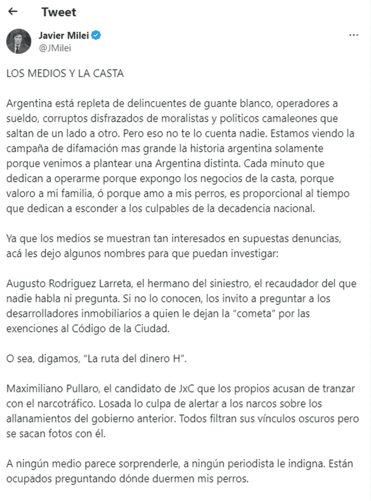 El economista liberal comenzó diciendo: “Estamos viendo la campaña de difamación más grande la historia argentina solamente porque venimos a plantear una Argentina distinta. Cada minuto que dedican a operarme porque expongo los negocios de la casta, porque valoro a mi familia, o porque amo a mis perros, es proporcional al tiempo que dedican a esconder a los culpables de la decadencia nacional”.