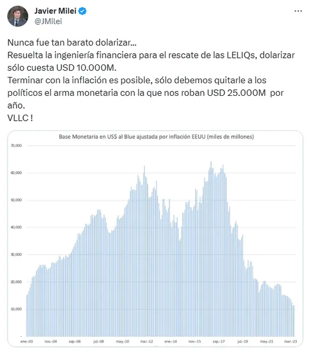 Allí, publicó un gráfico y en su mensaje sostuvo: “Terminar con la inflación es posible, sólo debemos quitarle a los políticos el arma monetaria con la que nos roban USD 25.000M».