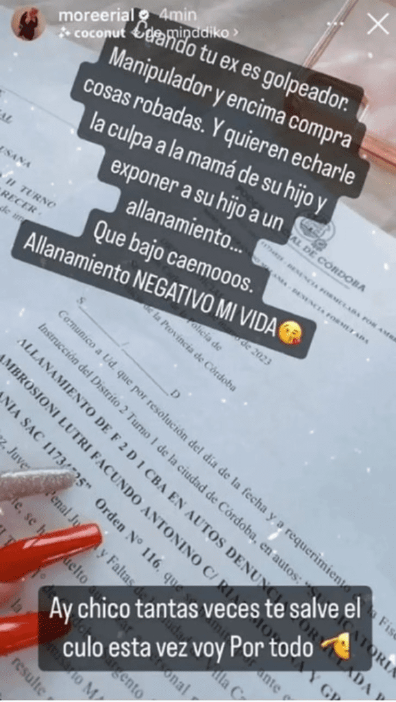 En una historia de Instagram, la mediática escribió: “Cuando tu ex es golpeador, manipulador y encima compra cosas robadas, y quieren echarle la culpa a la mamá de su hijo y exponer a su hijo a un allanamiento… Qué bajo caemos. Ay chico, tantas veces te salvé el culo… esta vez voy por todo”.