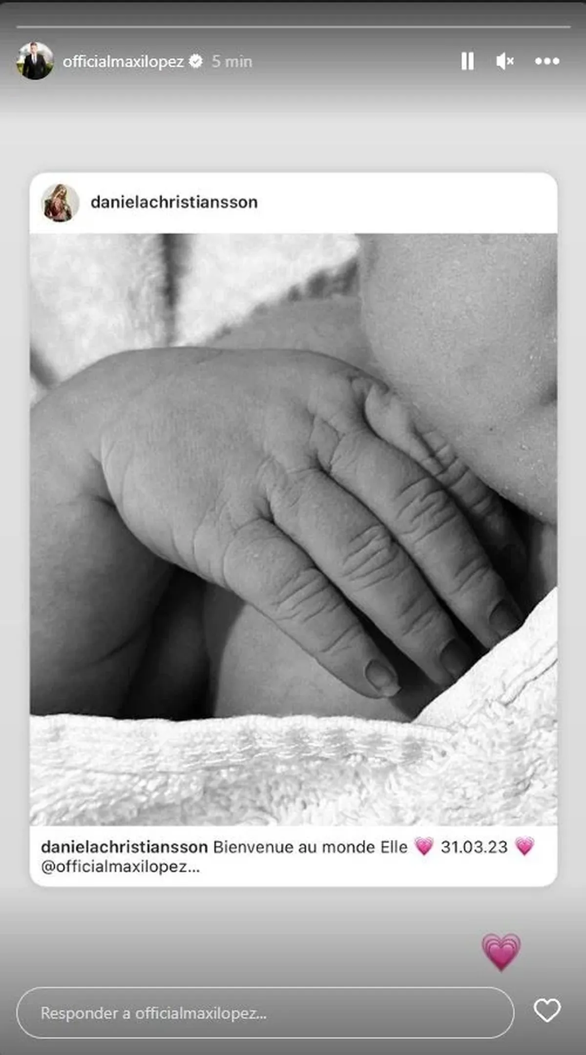 «Bienvenida al mundo, Elle», escribió Daniela al lado de una foto en donde se ve la manito de la recién nacida.