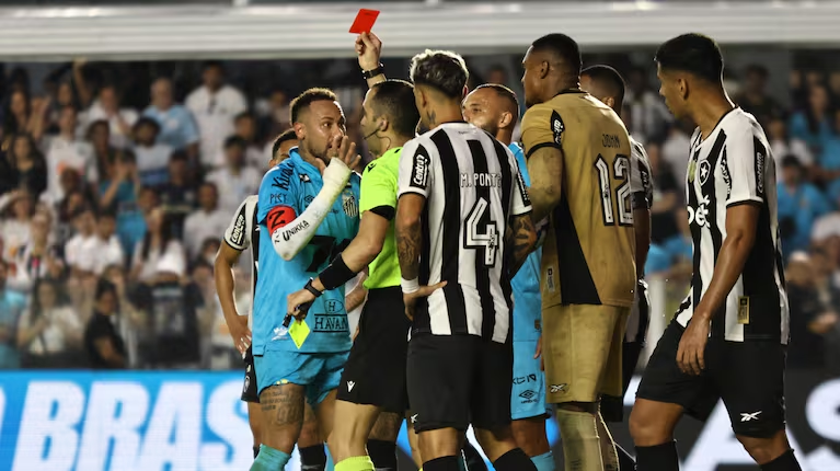 Neymar vio la tarjeta roja luego de una insólita mano en el área a los 30 minutos del segundo tiempo del partido ante Botafogo, equipo que finalmente se quedó con el triunfo gracias al gol de Artur a falta de solo cinco minutos para el final del encuentro.