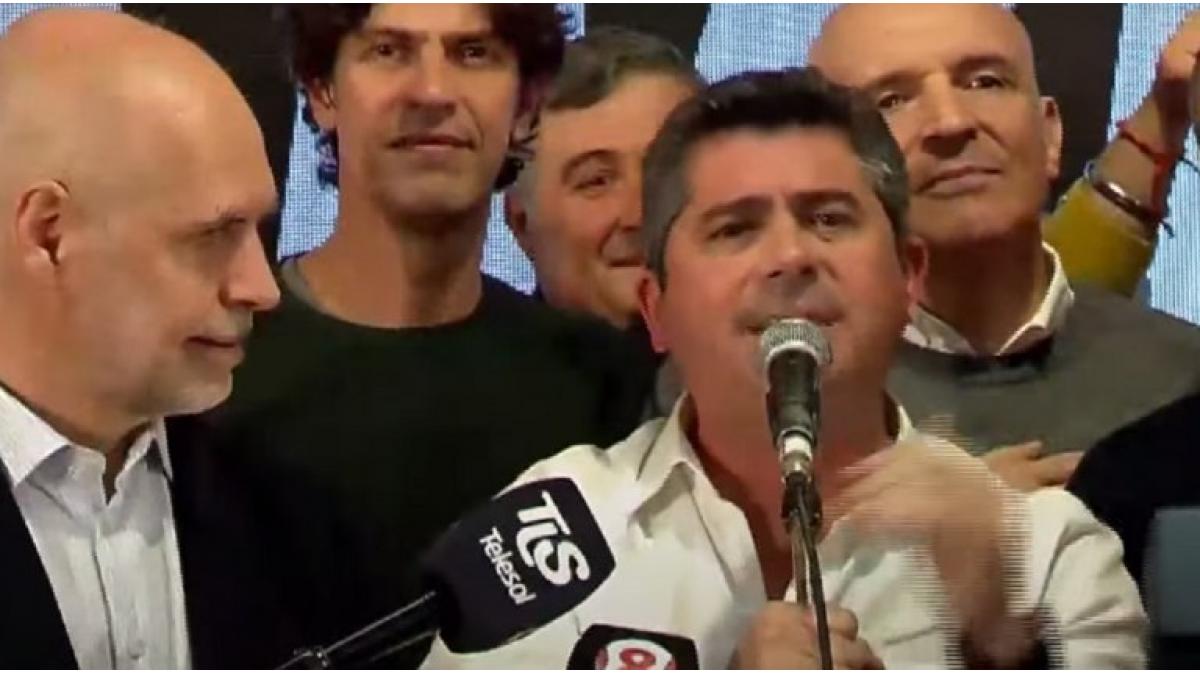 El gobernador electo de San Juan, Marcelo Orrego, celebró el resultado en las elecciones junto a las autoridades nacionales de Juntos por el Cambio, entre ellas Horacio Rodríguez Larreta.