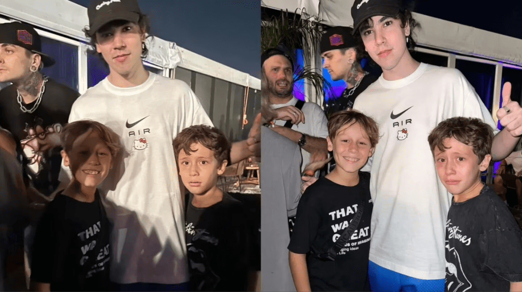 “Cuando mi hermano conoció a su ídolo”, publicó Beltrán, el hijo del medio de la modelo y Benjamín Vicuña, que también compartió una instantánea del momento a la que su mamá reaccionó con aplausos.