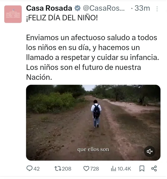 «Enviamos un afectuoso saludo a todos los niños en su día, y hacemos un llamado a respetar y cuidar su infancia. Los niños son el futuro de nuestra Nación”, indica el mensaje de la presidencia junto a un video.