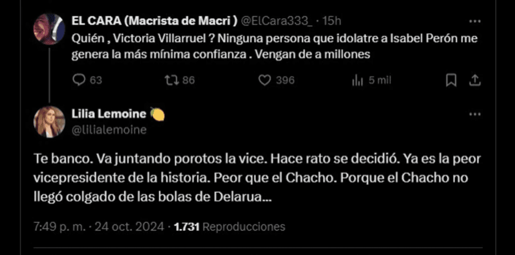 “Hace rato se decidió. Ya es la peor vicepresidente de la historia. Peor que el Chacho. Porque el Chacho no llegó colgado de las bolas de Delarua…”, concluyó la libertaria.