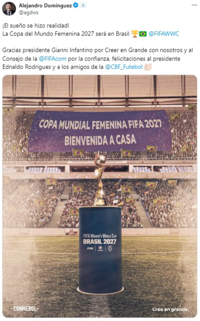 “¡El sueño se hizo realidad! La Copa del Mundo Femenina 2027 será en Brasil”, festejó el presidente de la Conmebol, Alejandro Domínguez, a través de sus redes sociales y agregó: “Gracias presidente Gianni Infantino por Creer en Grande con nosotros y al Consejo de la FIFA por la confianza”.