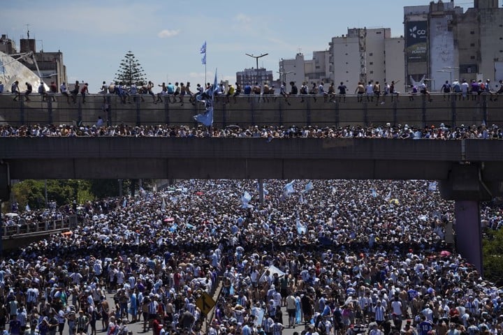 Ni grieta, ni temor a la «politización» del logro deportivo. Cansancio. El plantel campeón del mundo resolvió acotar los festejos a la peregrinación en micro, prevista inicialmente hasta el Obelisco pero modificada por la decisión de los organismos de Seguridad que debieron acatar, según el presidente de AFA, Claudio ‘Chiqui’ Tapia. Los futbolistas asumieron como último «esfuerzo» llegar al epicentro de los festejos y recorrer el trayecto con la gente que, sabían, iba a ser muchísima. Ya lo habían experimentado en la madrugada, cuando tardaron una hora para completar los seis kilómetros que separan el aeropuerto del predio.