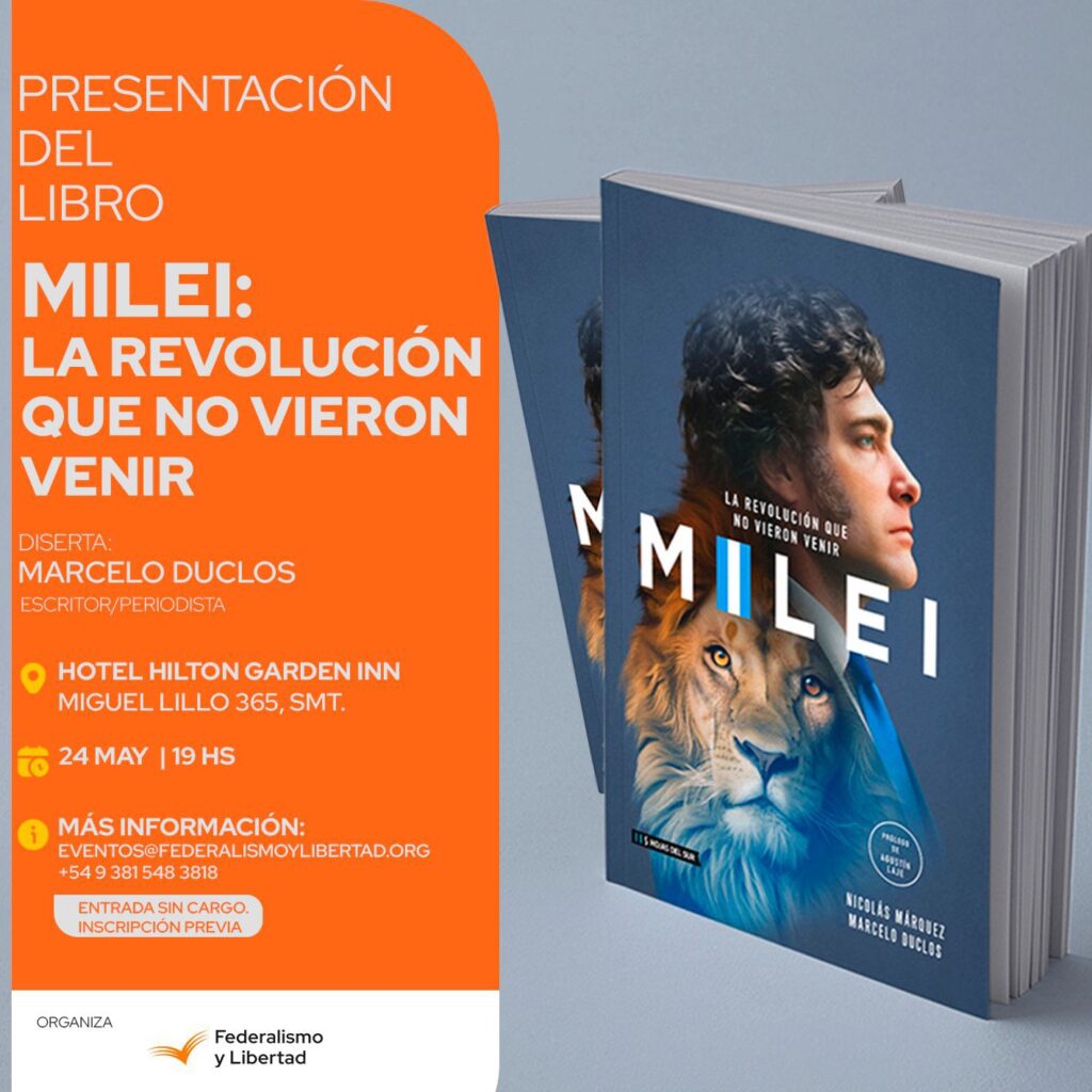 La Fundación Federalismo y Libertad invita este viernes a la presentación del libro biográfico de Javier Milei titulado “Milei: La revolución que no vieron venir”, de la mano de uno de sus autores, el periodista y escritor Marcelo Duclos.