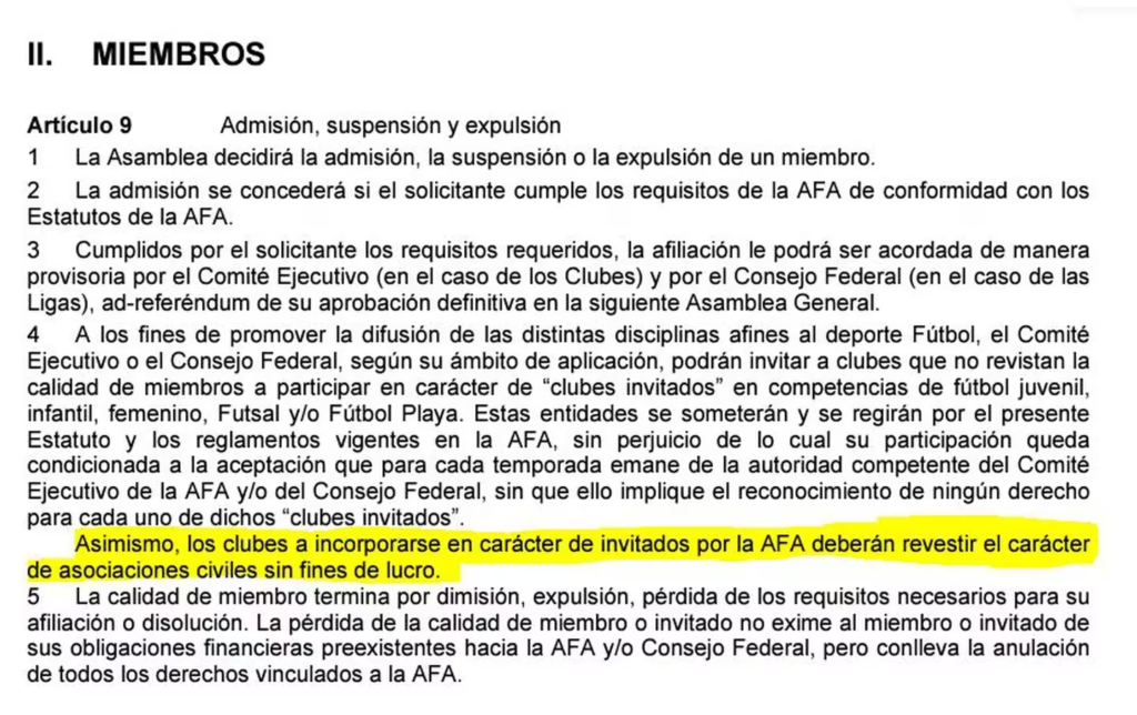 En el inciso 2, artículo 10, la AFA indica que los clubes invitados a incorporarse a la entidad “deberán revestir el carácter de asociaciones civiles sin fines de lucro”.