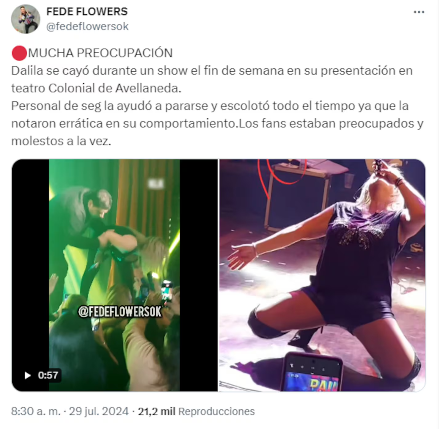 Dalila dio que hablar luego de un show que ofreció días atrás en el Teatro Colonial en Avellaneda. Sus fans se preocuparon porque aparentemente se cayó del escenario y muchos aseguraron que se la notó en estado de ebriedad que le impidió realizar el concierto con normalidad.